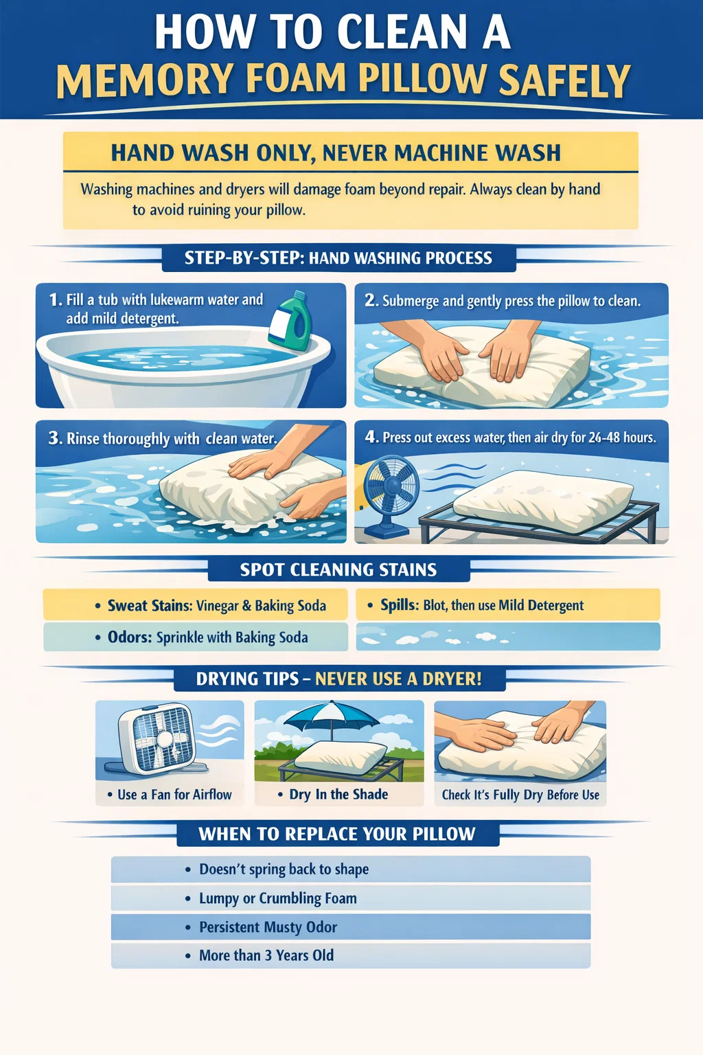 Den vigtigste regel, når du rengør en skumpude - især en memory-skumpude - er denne: læg det aldrig i en vaskemaskine eller tørretumbler . Omrøringscyklussen river skummets åbne cellestruktur fra hinanden, og varmen fra en tørretumbler nedbryder de viskoelastiske forbindelser, der giver memoryskum dets trykaflastende egenskaber. En memory foam-pude, der går igennem en enkelt maskinvask, vil aldrig genvinde sin oprindelige støtteform.