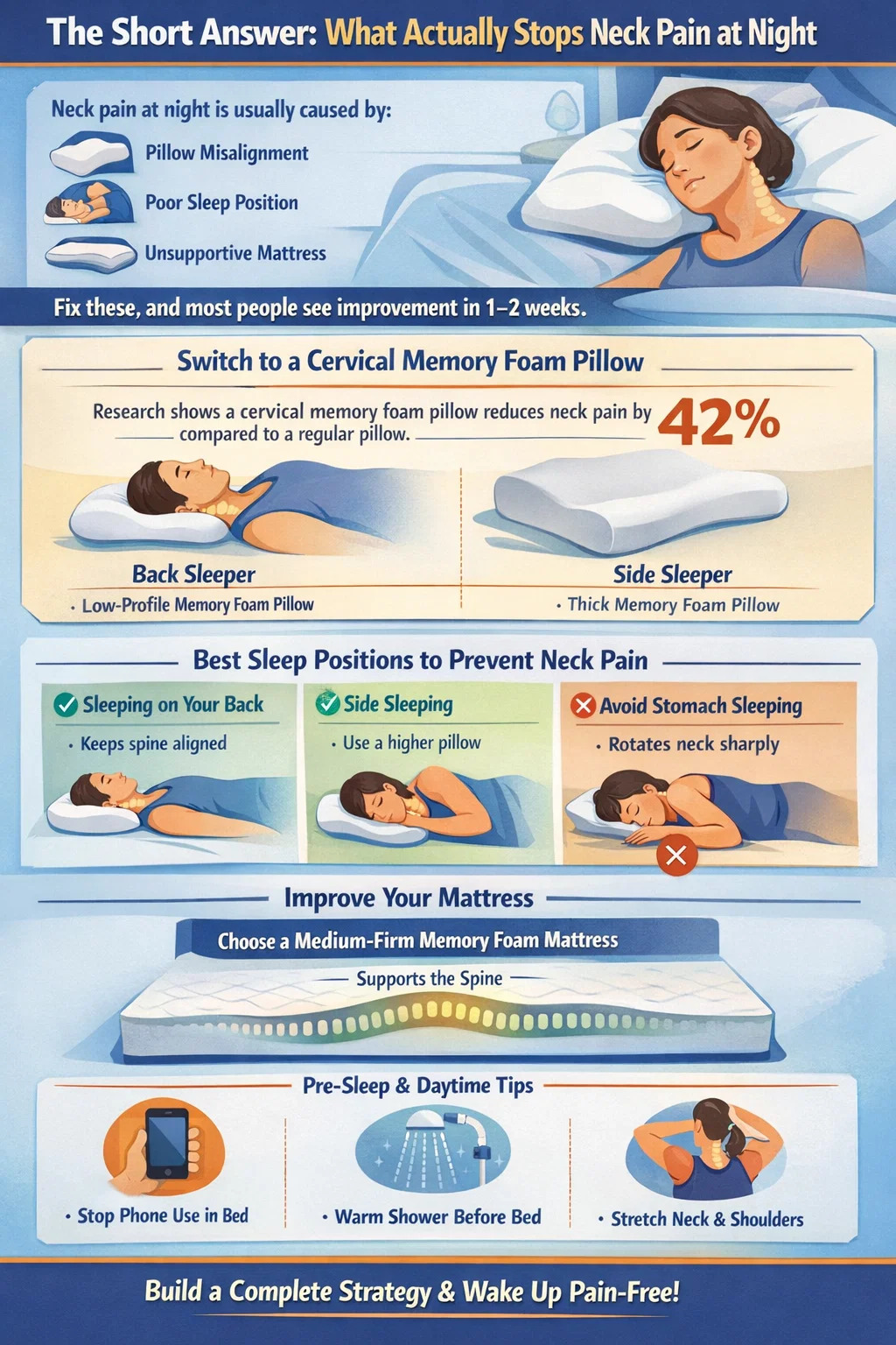 Nakkesmerter, mens du sover, er næsten altid forårsaget af en af tre ting: en pude, der sætter din halshvirvel ud af linie, en søvnposition, der belaster dine muskler i timevis af gangen, eller en madras, der ikke understøtter den naturlige kurve af din rygsøjle. Ret disse tre variabler, og de fleste ser en dramatisk forbedring inden for en til to uger.