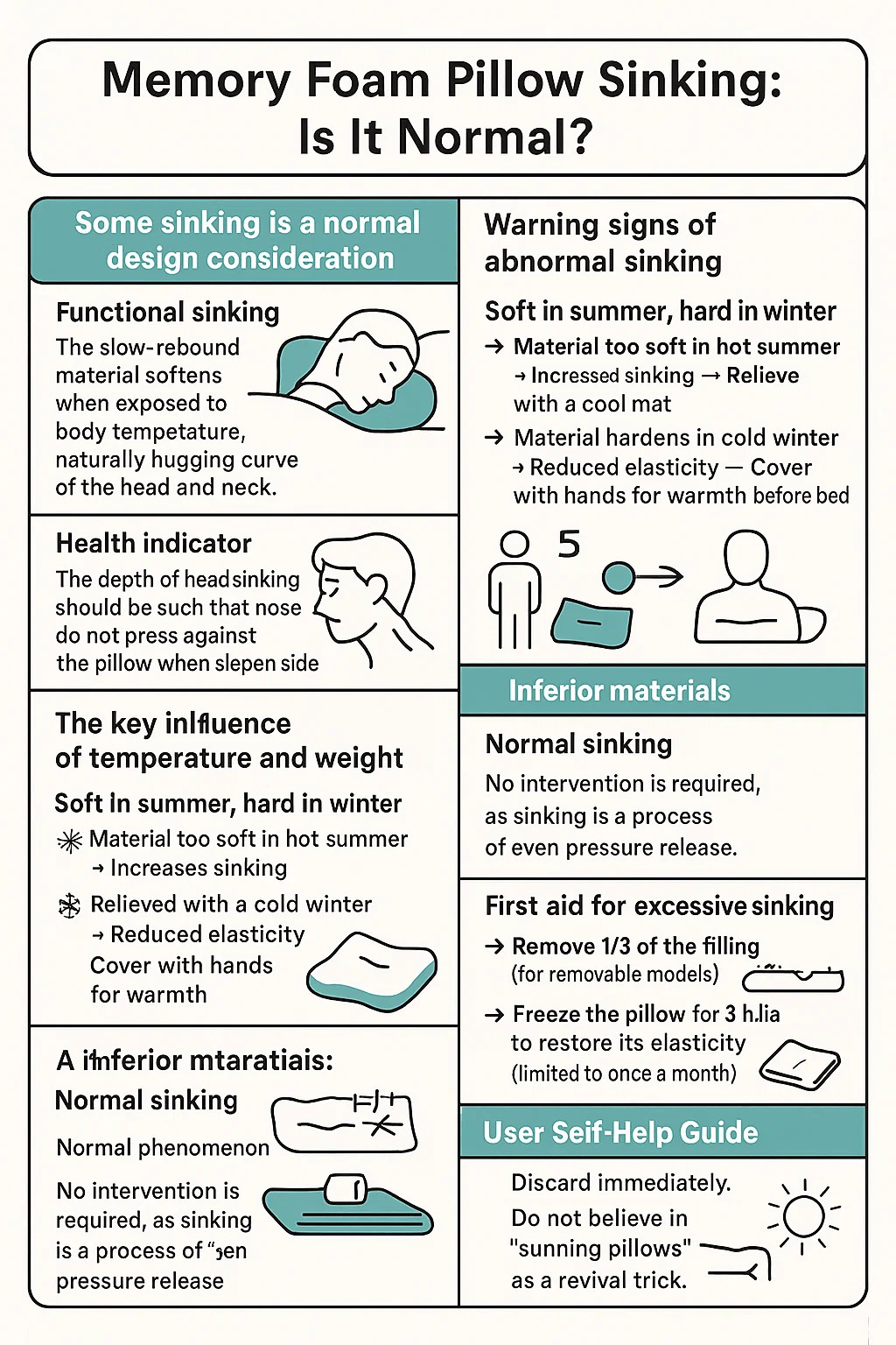Førstehjælp til overdreven synkning: → Fjern 1/3 af påfyldningen (for aftagelige modeller) → Anbring et foldet håndklæde under pudebetræk for midlertidig støtte → Frys puden i tre timer for at gendanne sin elasticitet (begrænset til en gang om måneden).