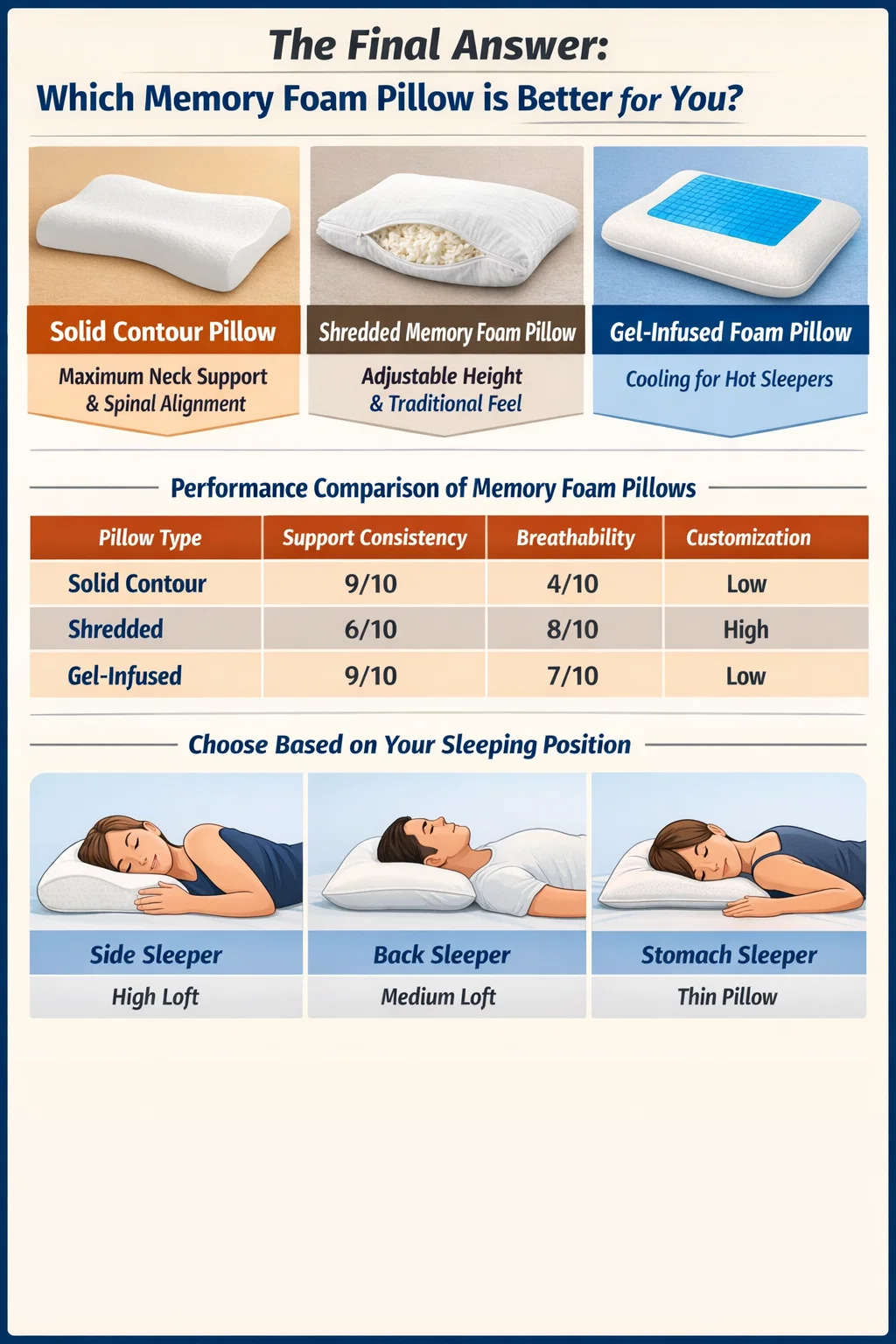 Der findes ikke en enkelt "bedste" pude, men der er en klar vinder baseret på dine specifikke sovevaner. Hvis du prioriterer maksimal nakkestøtte og rygmarvsjustering, a solid contour memory skum pude er overlegen. Hvis du foretrækker en traditionel fornemmelse med mulighed for at justere højden, en strimlet memory skum pude er det bedre valg. For dem, der ofte vågner op og sveder, en gelé-infunderet eller åbne celler memory skum pude er den eneste brugbare mulighed for at forhindre overophedning.